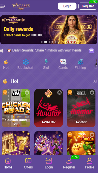 A huge collection of casino style mini games offered by V9. Some of the famous games of this application are cards, slots, poker, classic, teen Patti, fishing, live sports and many more.
